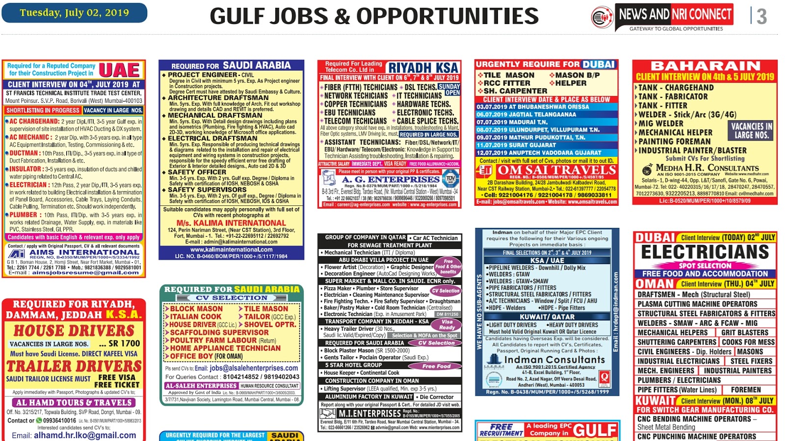 HomeUncategorized2 July 【News & NRI Connect e-Paper】Uncategorized2 July 【News & NRI Connect e-Paper】By Gulf JobJuly 3, 20190ShareFacebookWhatsApp WhatsApp Group Join WhatsApp News & NRI Connect Powered By www.gulfjobpaper.com Scroll Down & Like Our Facebook Page & Join Facebook Group. ~ Click here to download 2 July 2019 e-paper. File Size- 5 MB ~ Click here to view 2 July 2019 e-paper. Share this e-paper with Friends on WhatsApp Share on WhatsApp Latest Job, Gulf Job, Abroad Job, Iraq Job, Yemen Job, Bahrain Job, Egypt Job, Jordan Job, Yemen Job, Sudan Job, Dubai Job, Oman Job, Saudi Arabia Job, U.A.E Job, Qatar Job, Kuwait Job. WhatsApp Group Join WhatsApp Previous article3 July 2019 【Abroad Jobs】~ {e-paper}Next articleGulf Overseas Jobs ~ 4 JulyGulf Job