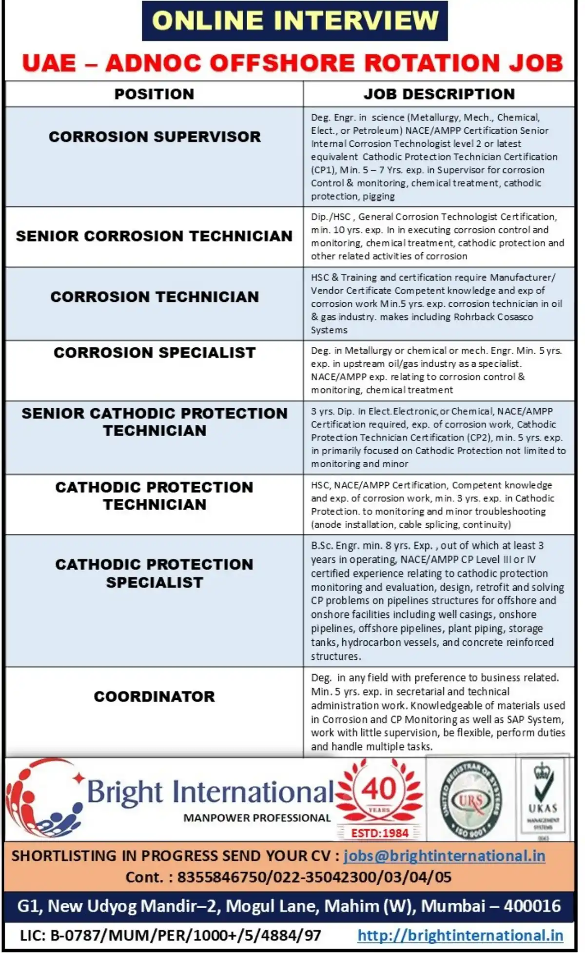 Join ADNOC Offshore in UAE for corrosion-related roles including Supervisor, Technician, Specialist, and Cathodic Protection experts. Online interviews conducted by Bright International. Apply now!