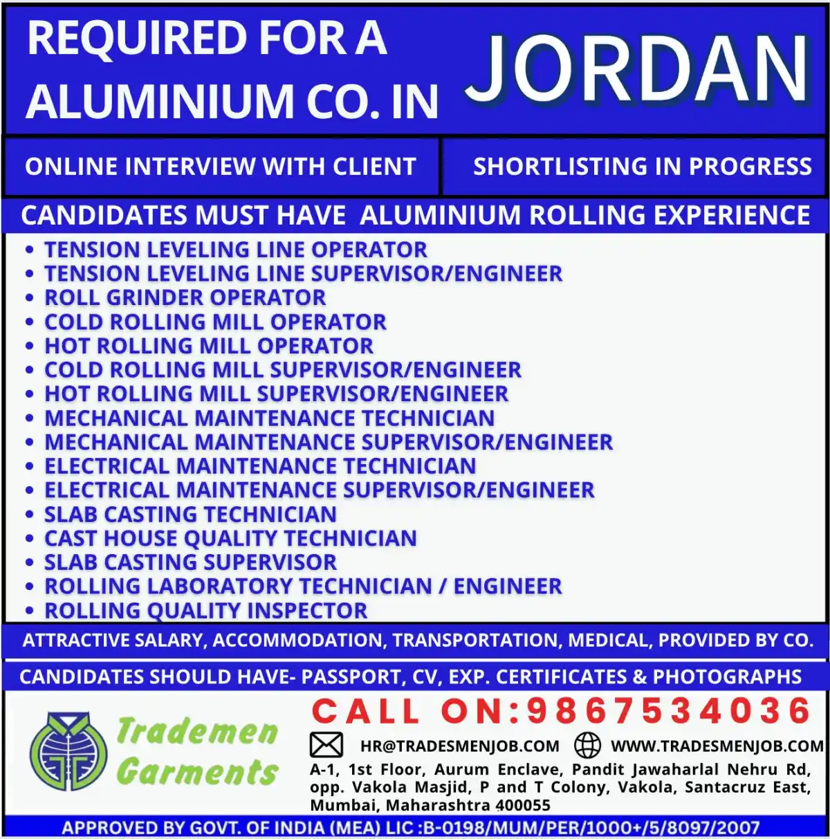 Interested candidates should contact us immediately at 9867534036 or email HR@TRADESMENJOB.COM. For more information, visit our website: www.tradesmenjob.com