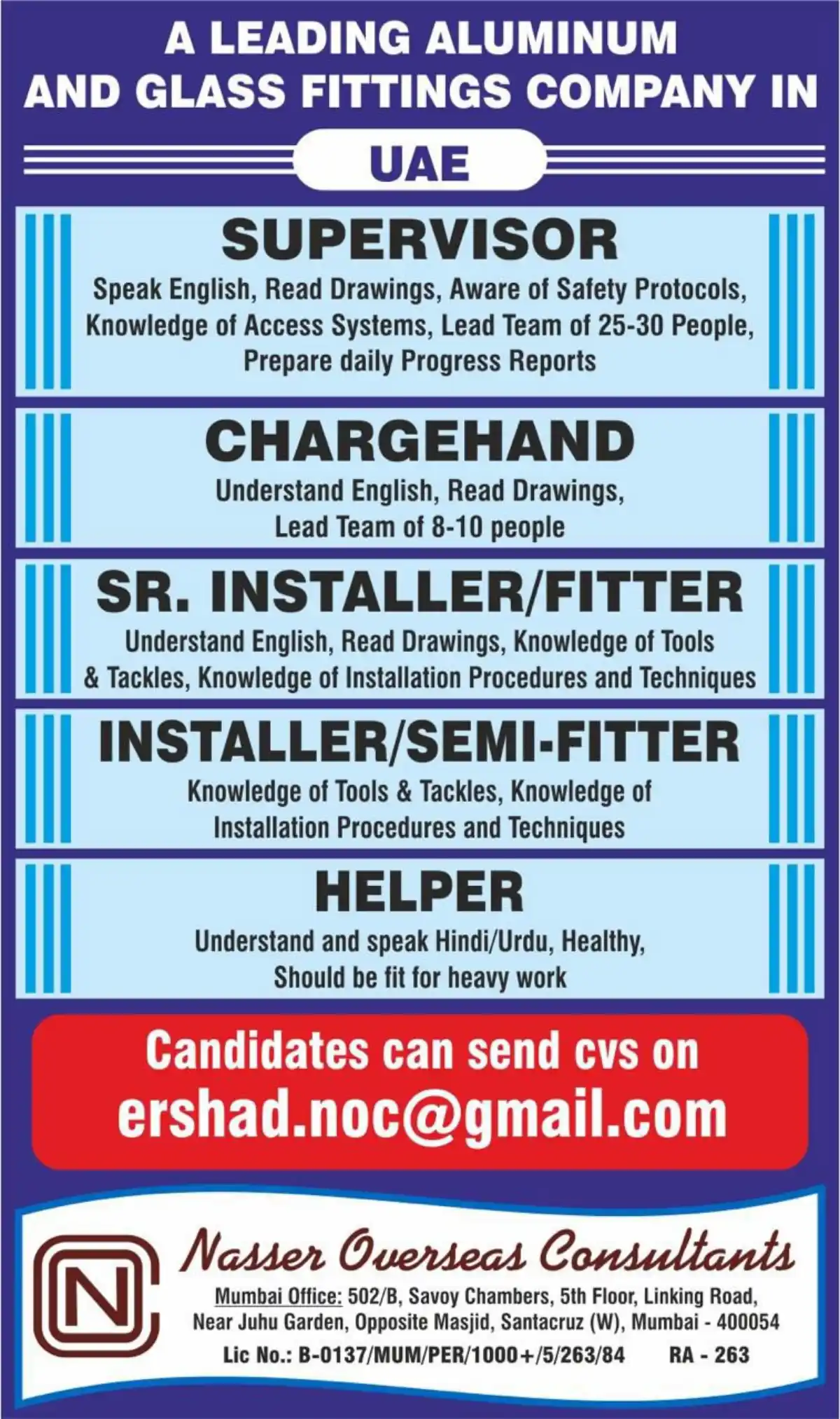 Leading aluminum and glass fittings company in UAE hiring Supervisor, Chargehand, Sr. Installer/Fitter, Installer/Semi-Fitter, and Helper positions. Send CVs to ershad.noc@gmail.com
