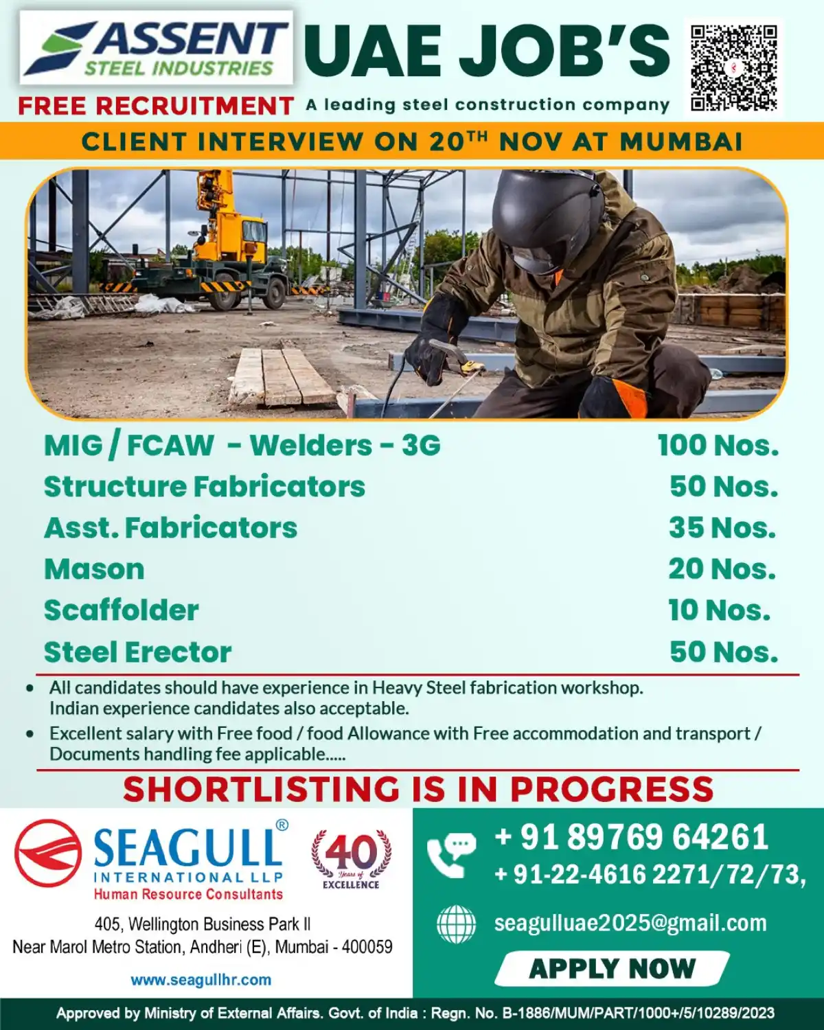 Apply for various steel industry jobs in UAE with ASSENT. Free recruitment drive with client interview on 20th November 2023 in Mumbai. Excellent salary, free accommodation, food, and transport provided.