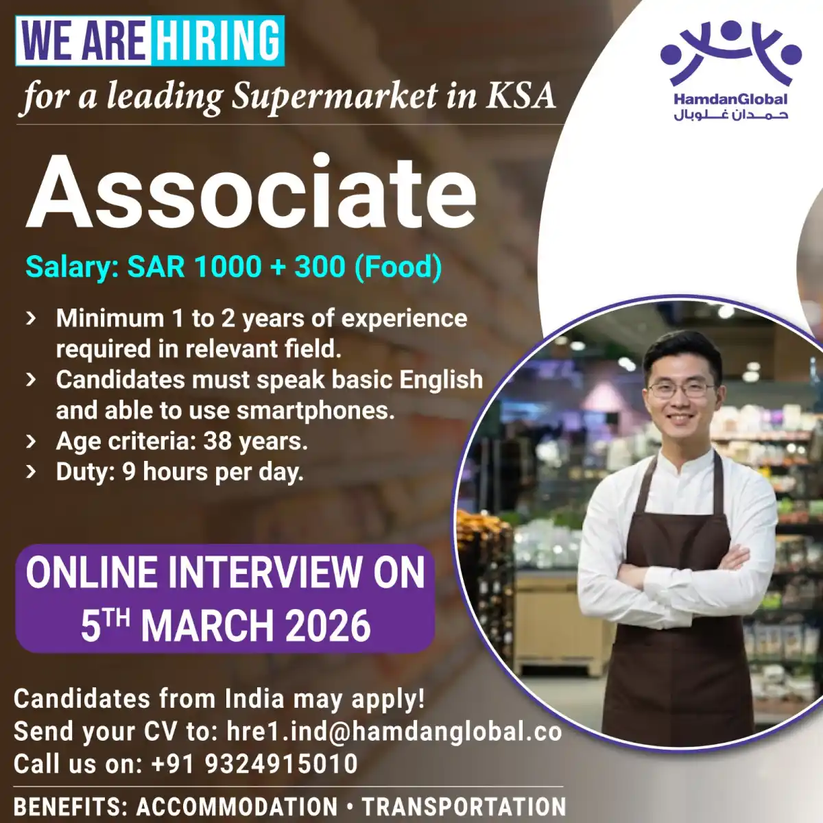 HamdanGlobal is hiring Associates for a leading supermarket in KSA. Earn SAR 1000 + 300 (Food). Benefits include accommodation & transportation. Online interview on 5th March 2026. Apply now!