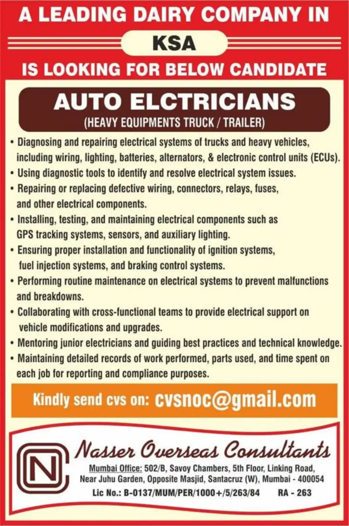 Interested candidates should send their updated CV to CVSnoc@gmail.com with the subject line “Auto Electrician Application – KSA Dairy Company.”