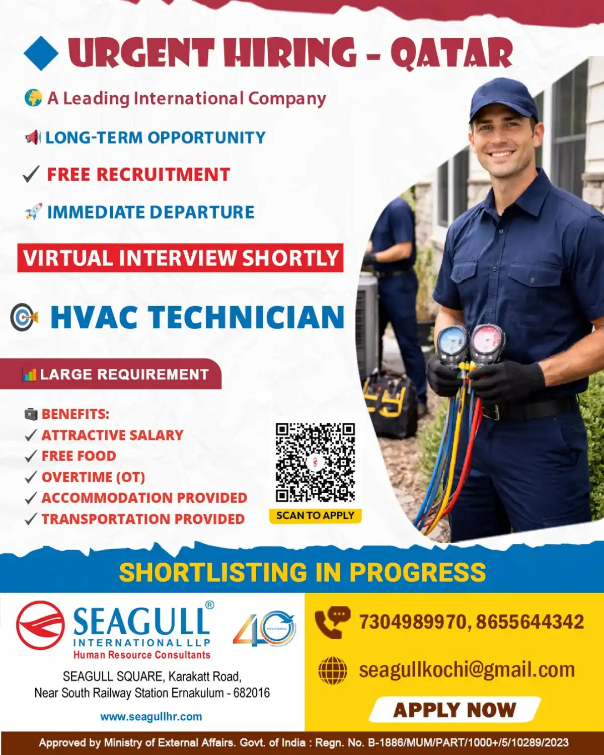 A leading international company in Qatar is urgently hiring CHVAC Technicians on a long-term basis. This is a large-scale requirement with immediate departure. The recruitment is absolutely FREE, and virtual interviews will be conducted shortly.