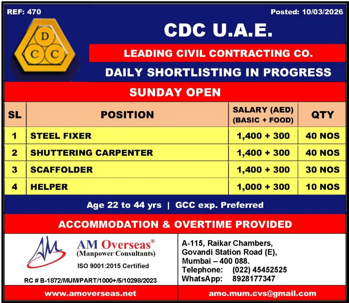 CDC U.A.E. (Leading Civil Contracting Company) is conducting immediate hiring for multiple construction positions through AM Overseas, an ISO 9001:2015 certified manpower consultancy. Daily shortlisting is in progress with Sunday interviews open.