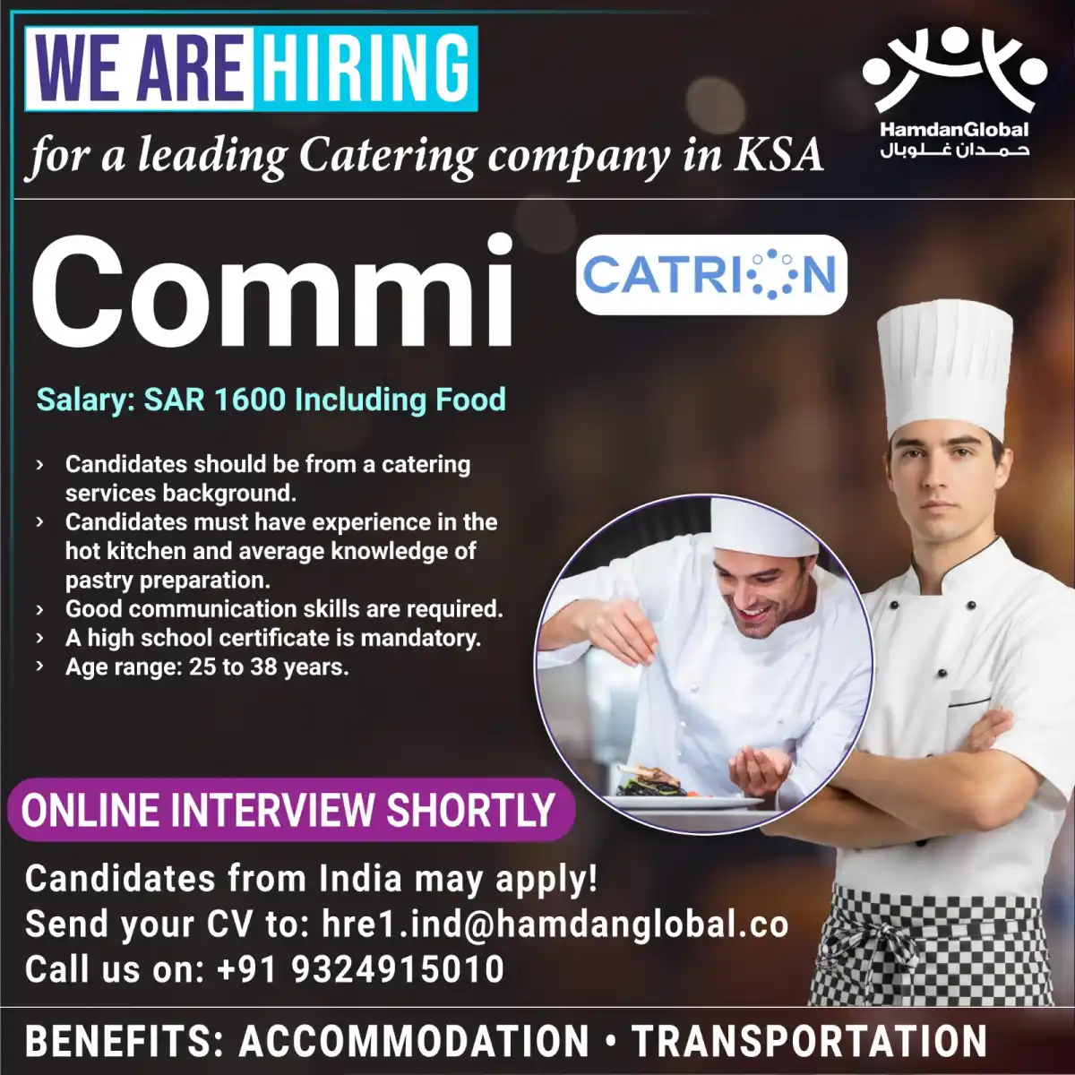 Apply for Commi CATRION position in Saudi Arabia. Salary SAR 1600 with food, accommodation & transportation. Hot kitchen experience required. Online interview for Indian candidates.