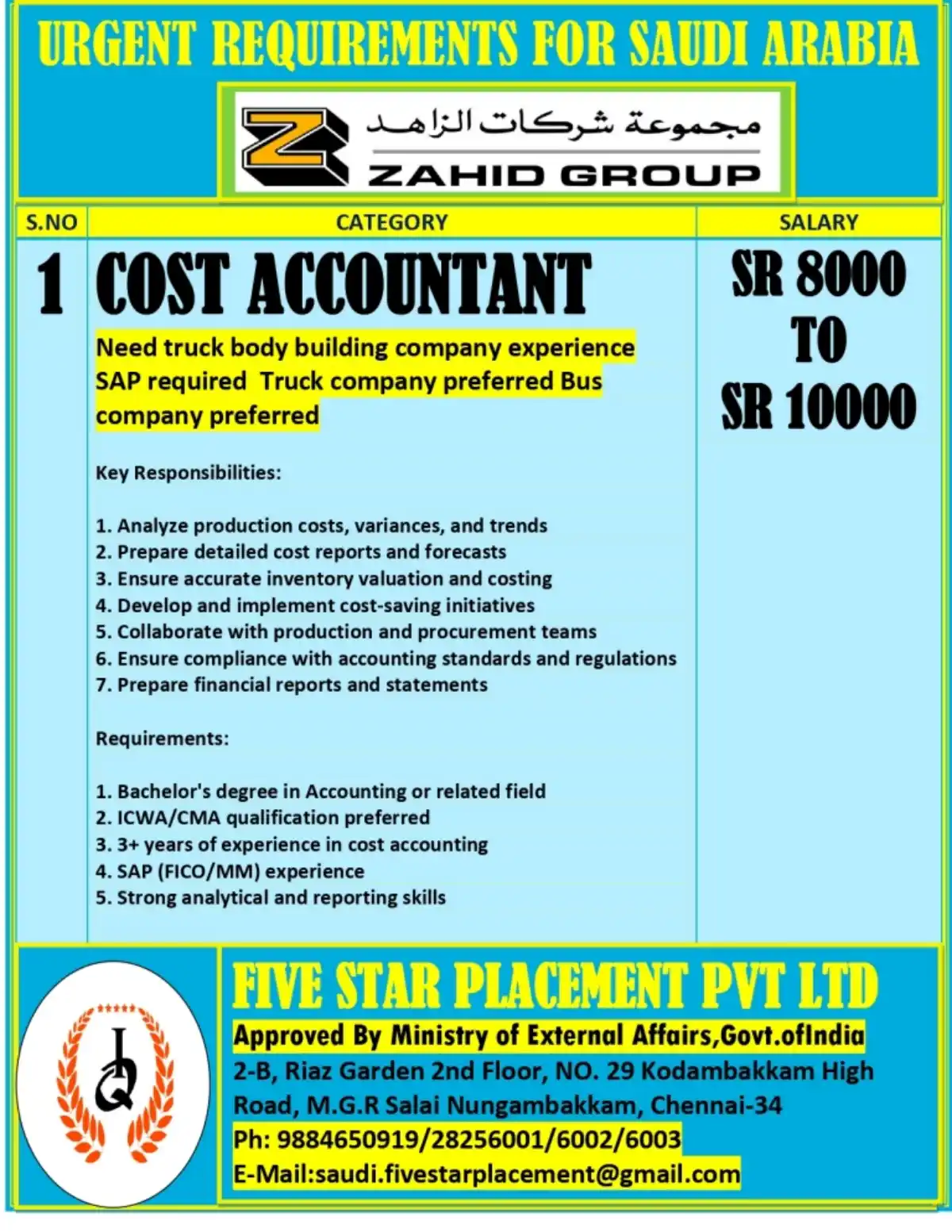 Apply for Cost Accountant position at Zahid Group in Saudi Arabia. Requires truck body building experience, SAP skills, and cost accounting expertise. Salary SR 8000-10000. Email resume to saudi.fivestarplacement@gmail.com