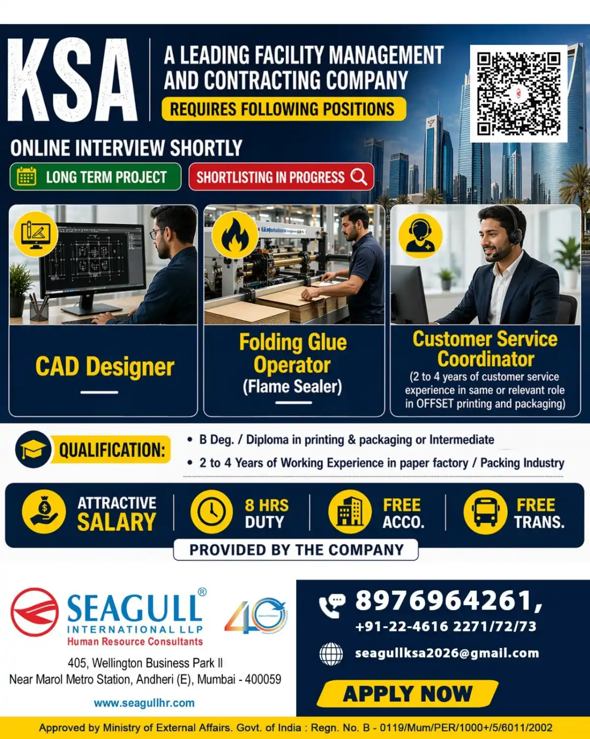 A leading facility management and contracting company in Saudi Arabia is urgently hiring for multiple positions for a long-term project. Online interviews will be conducted shortly, and shortlisting is currently in progress.