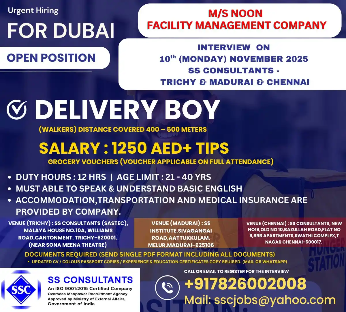 Apply for the Delivery Boy job in Dubai with M/S NOON. Earn 1250 AED + tips, with accommodation, transport, and medical insurance. Walk-in interview on 10th Nov 2025 in Trichy, Madurai, Chennai.