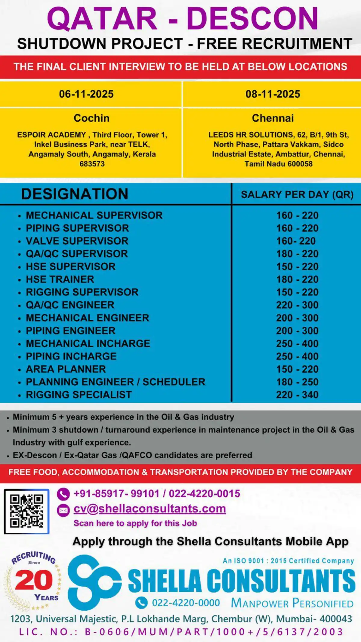 – Candidates with prior experience at DESCON, Qatar Gas, or QAFCO are highly preferred.