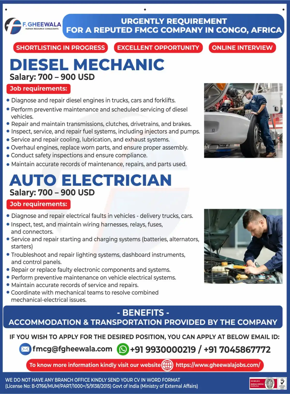 Apply for Diesel Mechanic and Auto Electrician positions in Congo with salary 700-900 USD. Accommodation and transportation provided. Online interview in progress. Send CV to fmcg@fgheewala.com.