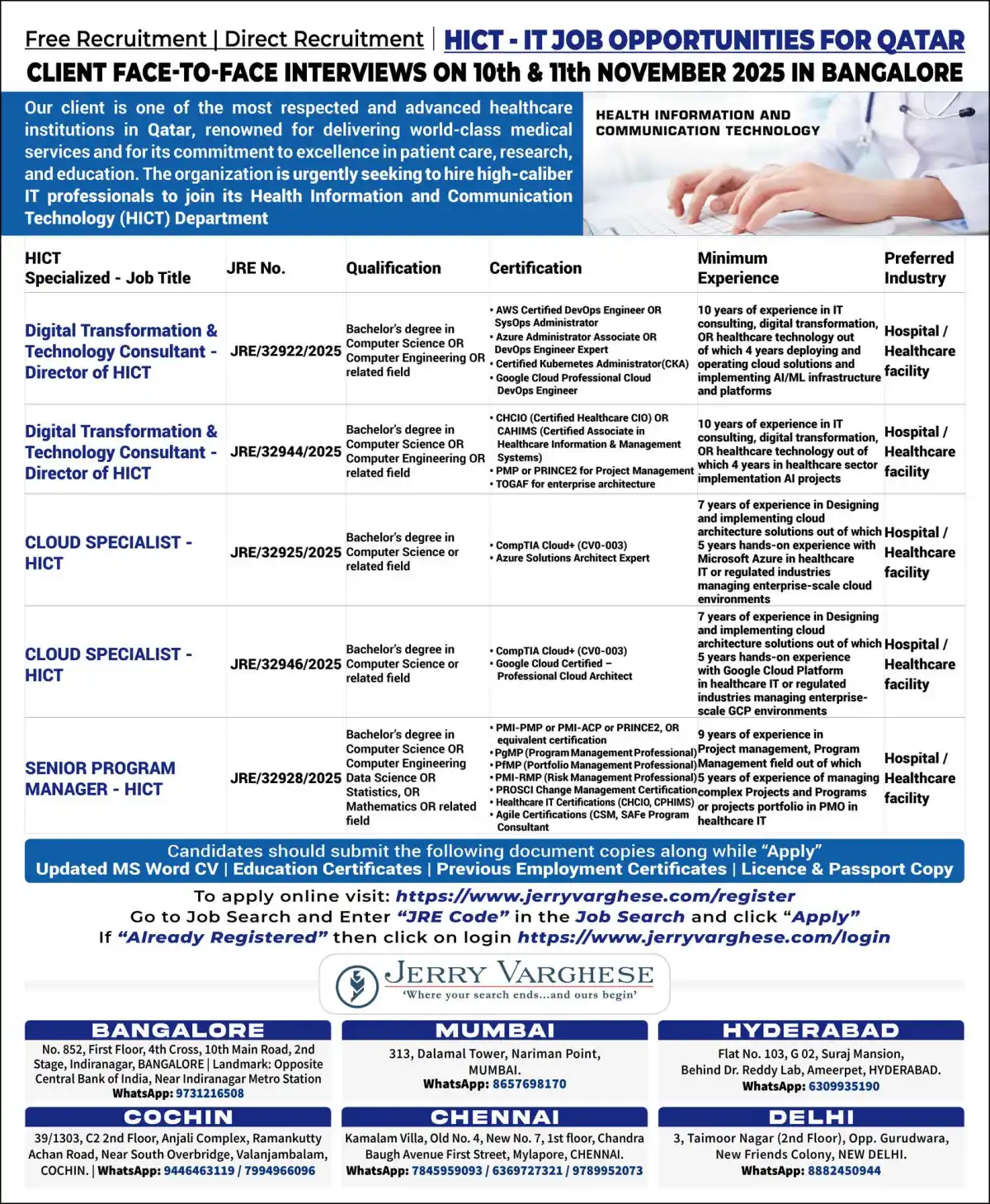 Apply for HICT IT job opportunities in Qatar’s leading healthcare institution. Direct recruitment with client interviews on 10th & 11th Nov 2025 in Bangalore. Roles include Digital Transformation Director and Cloud Specialist.