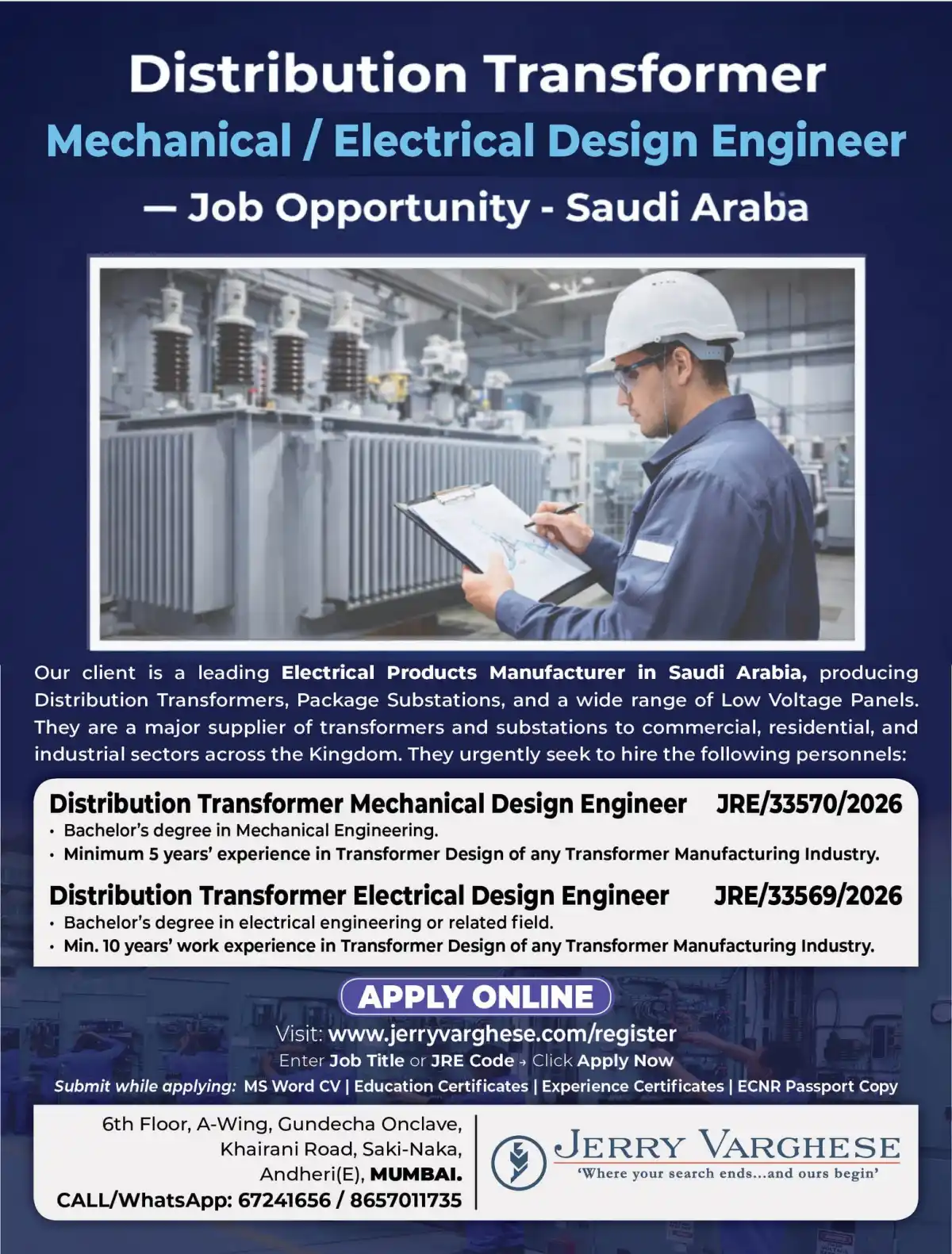 Leading electrical manufacturer in Saudi Arabia urgently hiring Distribution Transformer Mechanical & Electrical Design Engineers. 5-10 years transformer design experience required. Apply with JRE codes 33570 & 33569.