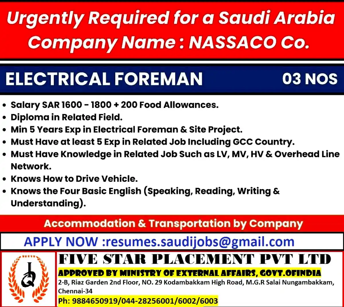 Apply now for the Electrical Foreman position at NASSACO Co. in Saudi Arabia. Salary SAR 1600-1800 + food allowances. Minimum 5 years experience required. Email resume to resumes.saudijobs@gmail.com.