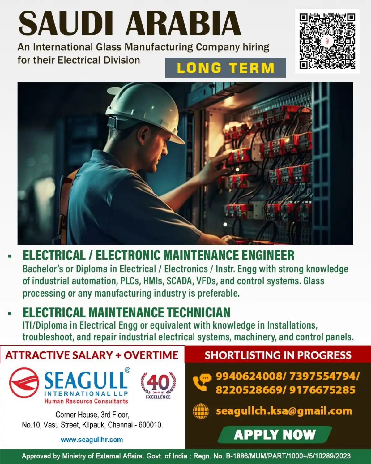 Apply for Electrical Maintenance Engineer and Technician positions in Saudi Arabia. Long-term roles with attractive salary, overtime, and opportunities in glass manufacturing. Immediate hiring through SEAGULL INTERNATIONAL LLP.