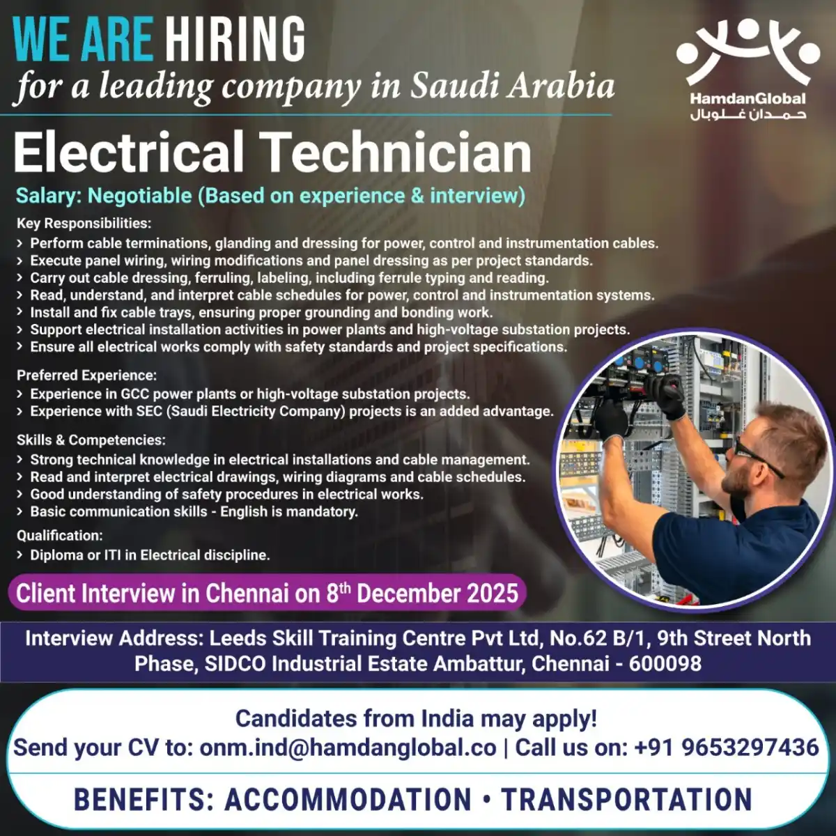 Apply for Electrical Technician role in Saudi Arabia. Perform cable terminations, panel wiring in power plants. Negotiable salary, accommodation & transport. Interview in Chennai on 8th Dec 2025.