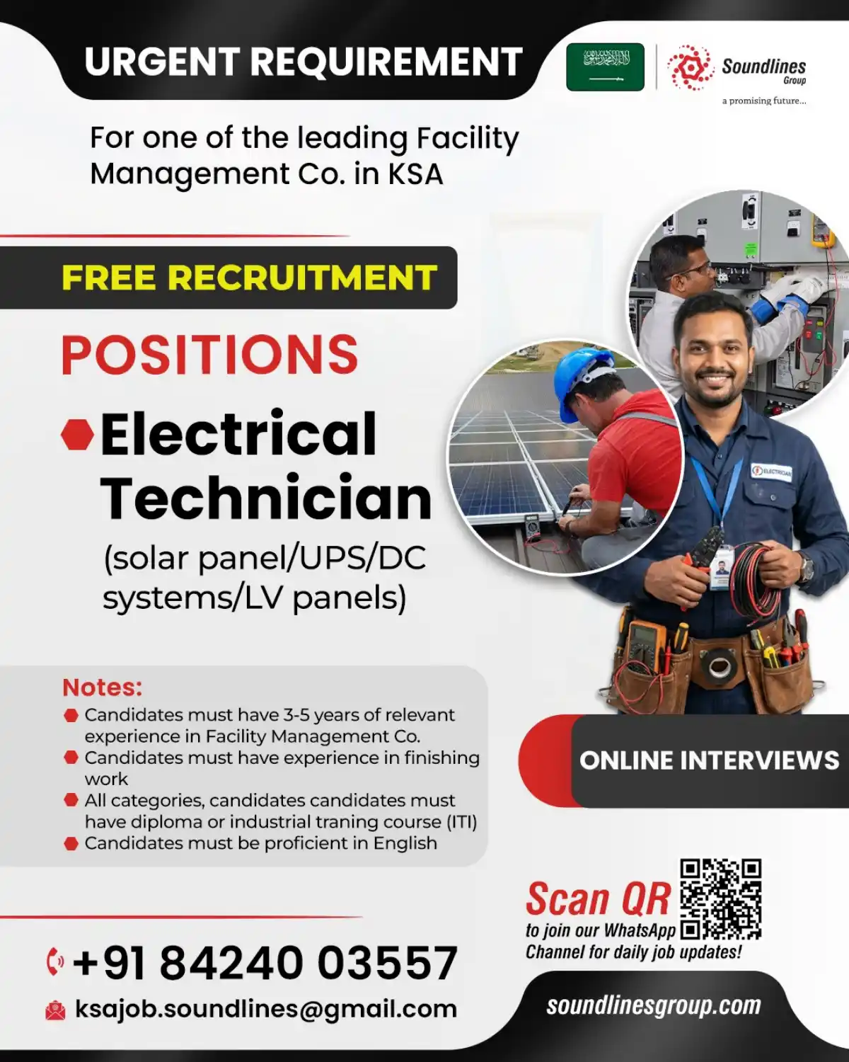 Soundlines Group urgently seeks Electrical Technician with solar panel, UPS, DC systems, LV panels experience for Facility Management position in KSA. Free recruitment. 3-5 years experience required.