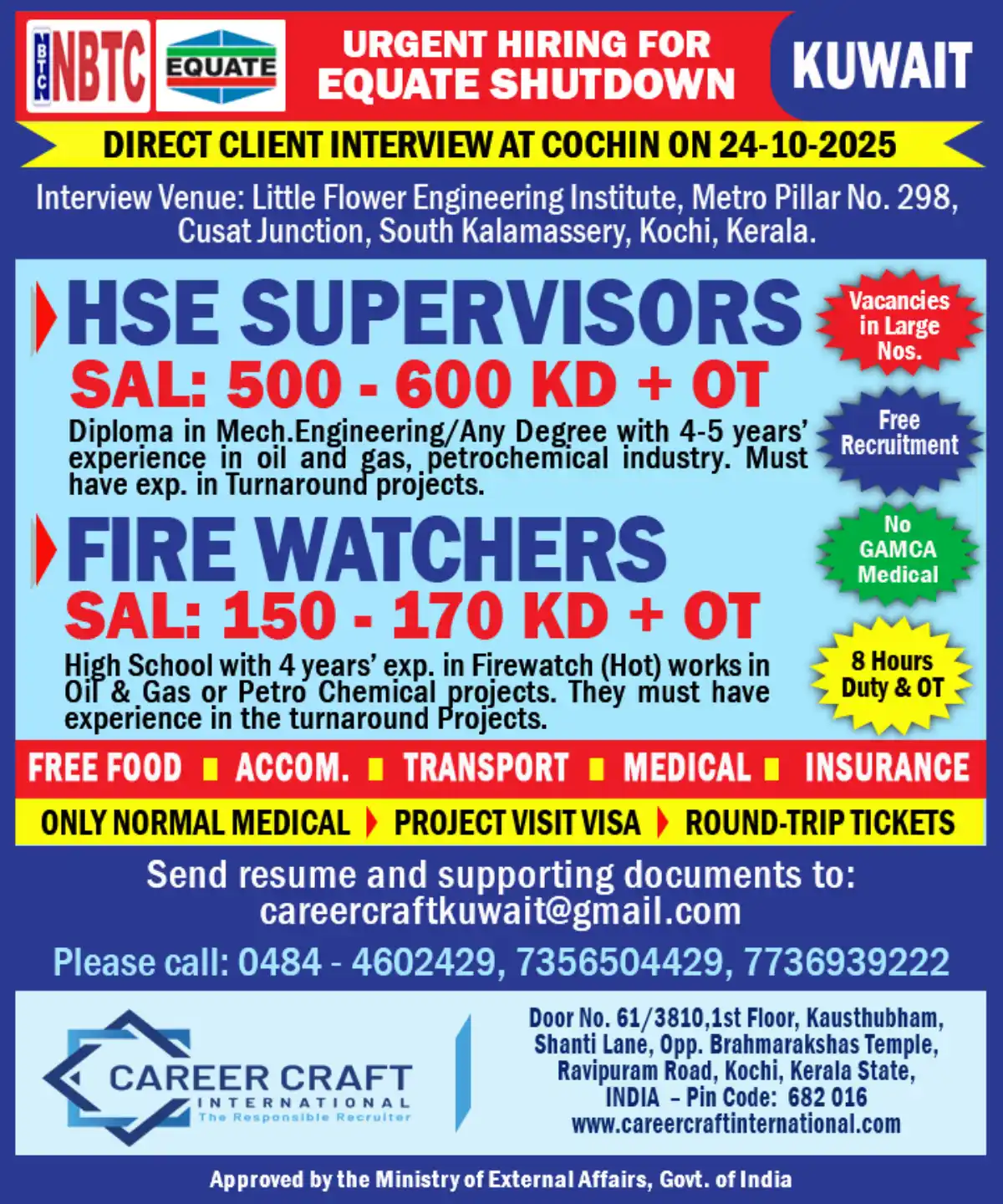 NBTC is conducting urgent hiring for the EQUATE SHUTDOWN project in Kuwait. This is a fantastic opportunity for professionals in the oil and gas industry to join a major turnaround project. Direct client interviews will be held in Cochin, Kerala, on October 24, 2025.