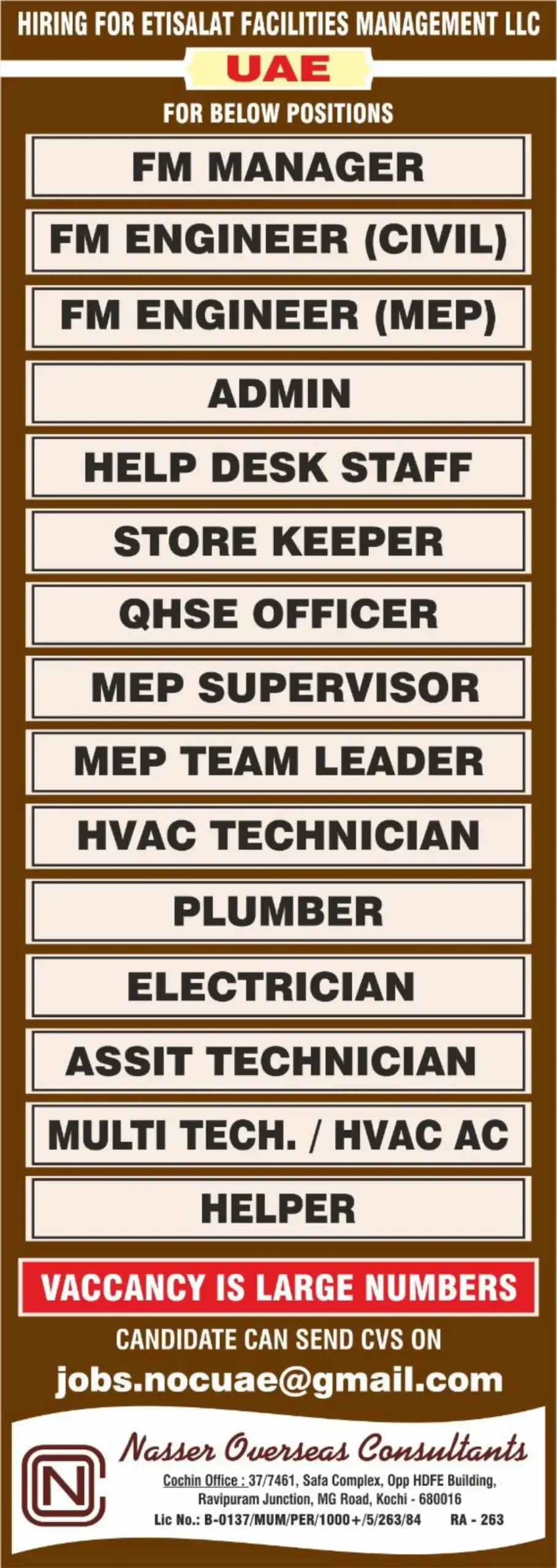 Etisalat Facilities Management LLC is hiring for FM Manager, Engineer, Admin, Technician & Helper roles in UAE. Large vacancies. Apply now with your CV.