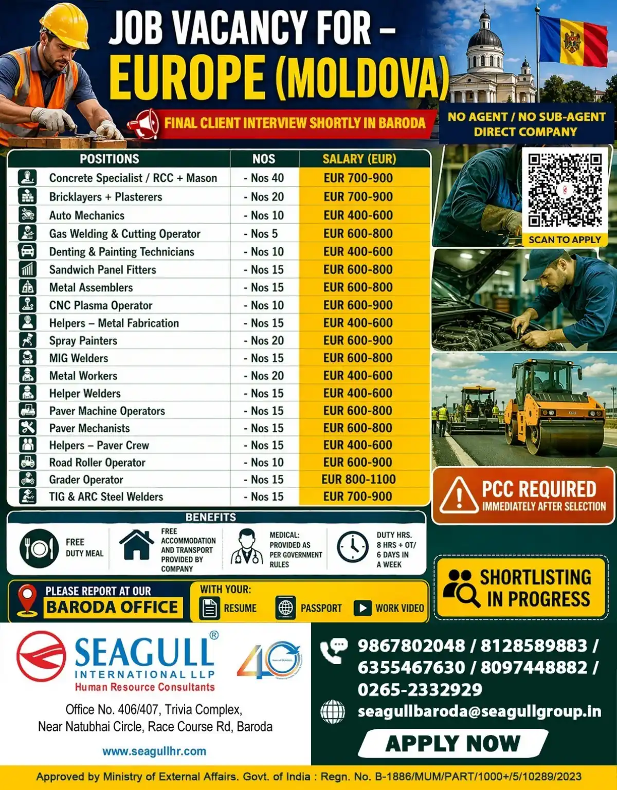 We are urgently hiring for multiple positions in Europe (Moldova) for a leading client. This is a direct company recruitment with no agent or sub-agent fees. Final client interviews will be held shortly in Baroda, Gujarat.