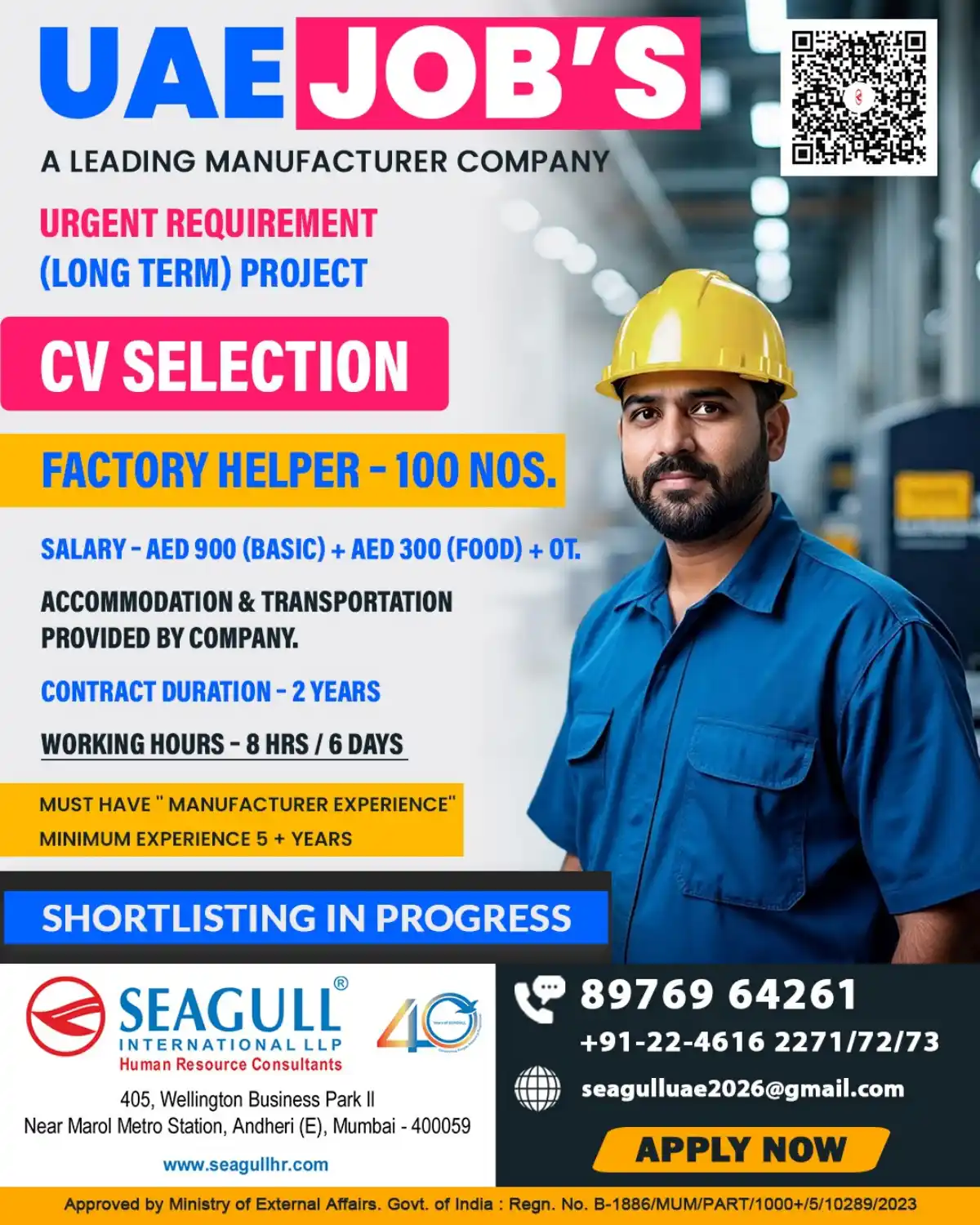 SEAGULL 40 INTERNATIONAL LLP, a premier human resource consultant approved by the Ministry of External Affairs, Government of India, is urgently recruiting for a leading manufacturer company in the UAE. We are conducting CV selection for a long-term project with multiple vacancies for Factory Helper roles. This is a fantastic opportunity for experienced professionals to join a dynamic team in the UAE manufacturing sector.