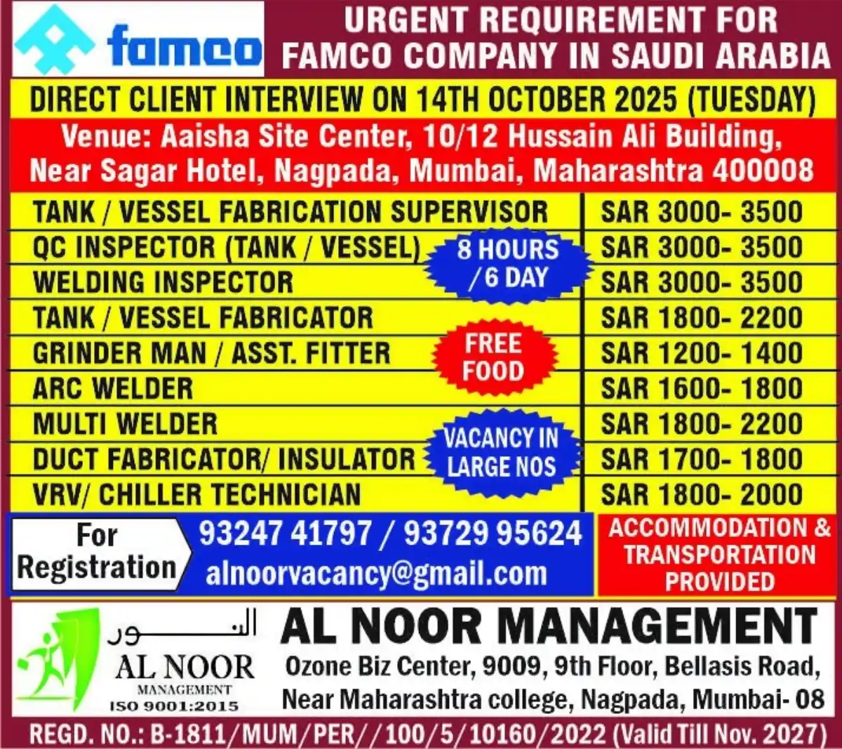 Apply now for multiple job positions at Famco Company in Saudi Arabia. Direct client interview on 14th October 2025 in Mumbai. Free accommodation, transportation, and food provided. Salaries range from SAR 1200 to SAR 3500.