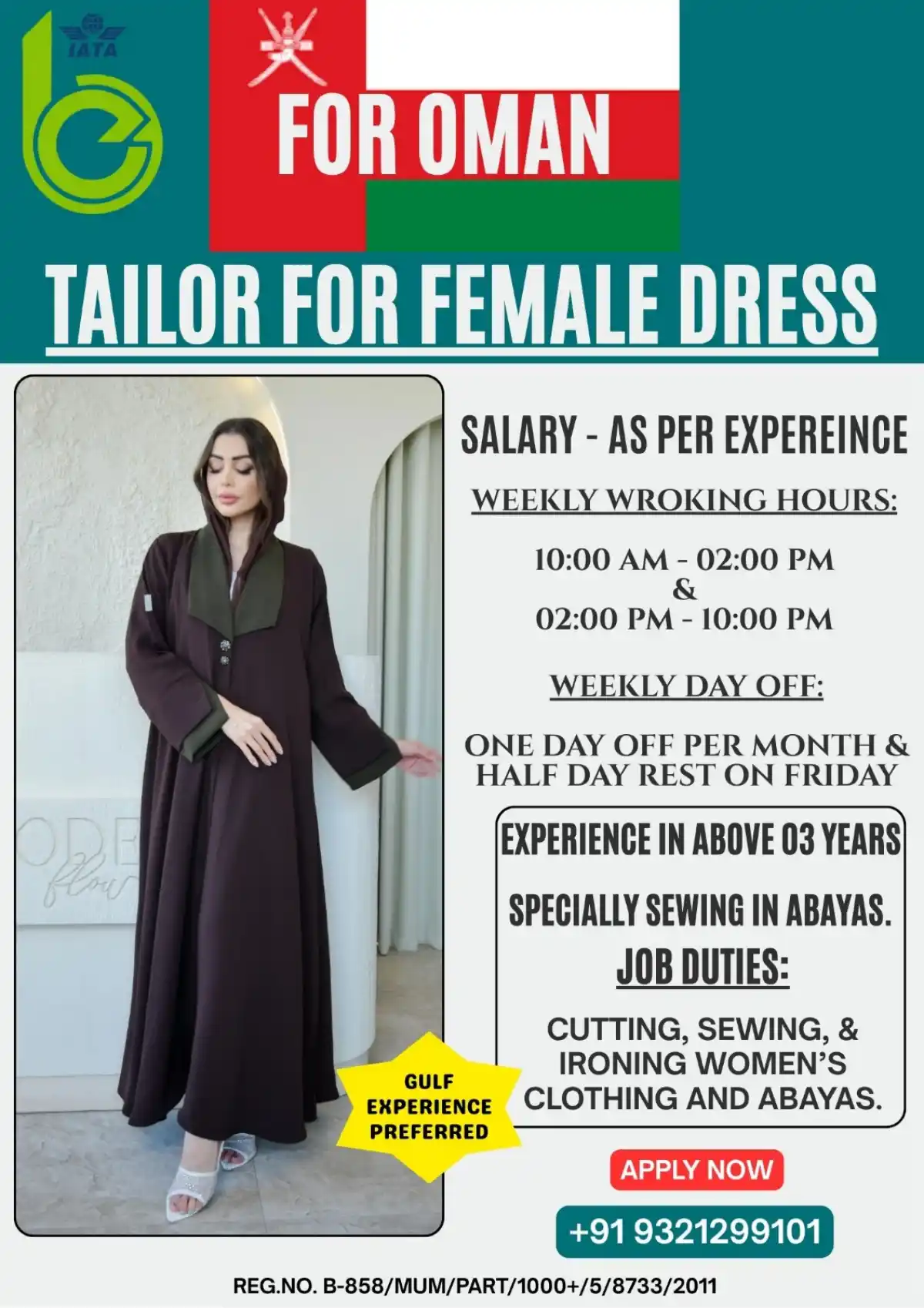 Apply for female dress tailor job in Oman. Minimum 3 years experience in abaya sewing required. Salary based on experience. Contact +91 9321299101.