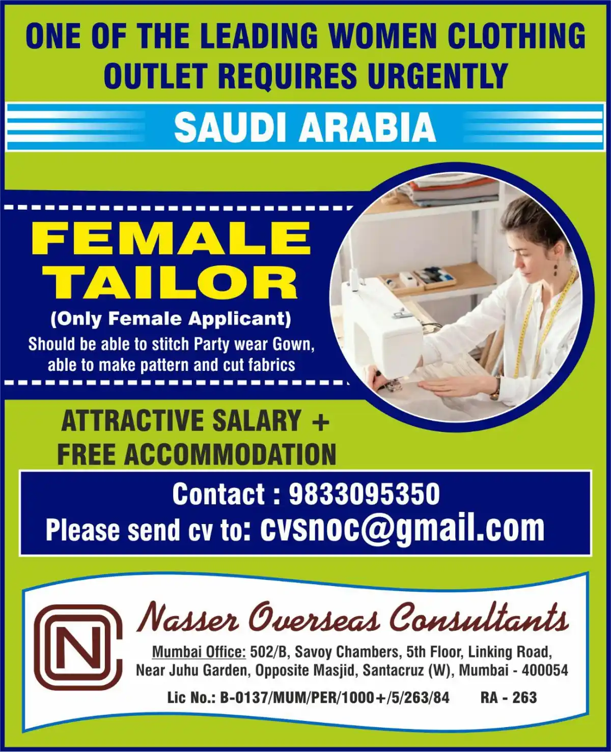 Apply now for a Female Tailor position in Saudi Arabia. Must stitch party wear gowns, make patterns, and cut fabrics. Attractive salary and free accommodation provided. Contact today!