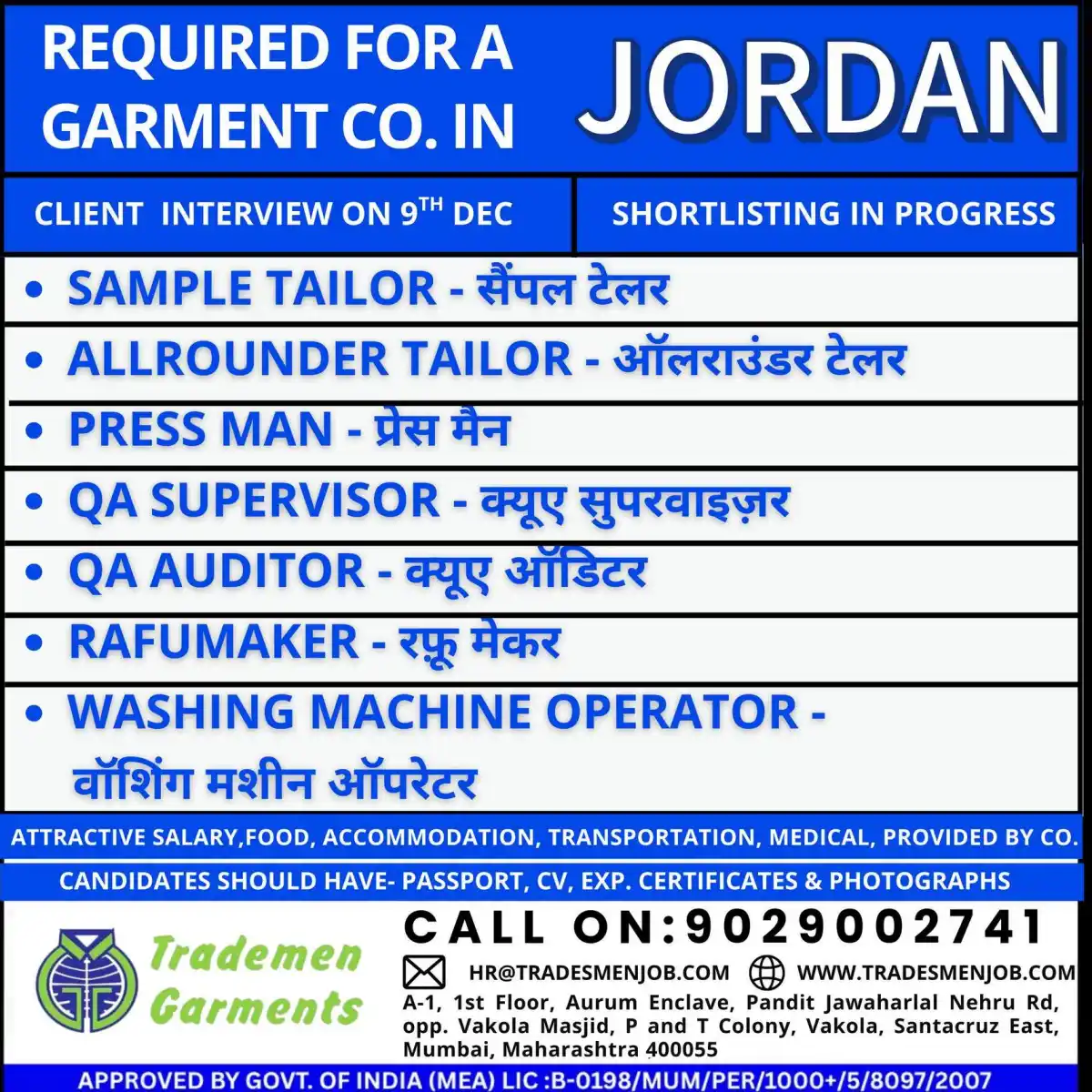 Apply for garment jobs in Jordan including Sample Tailor, QA Supervisor, and more. Client interview on 9th Dec. Attractive salary, accommodation, and benefits provided by company. Approved by Govt. of India.