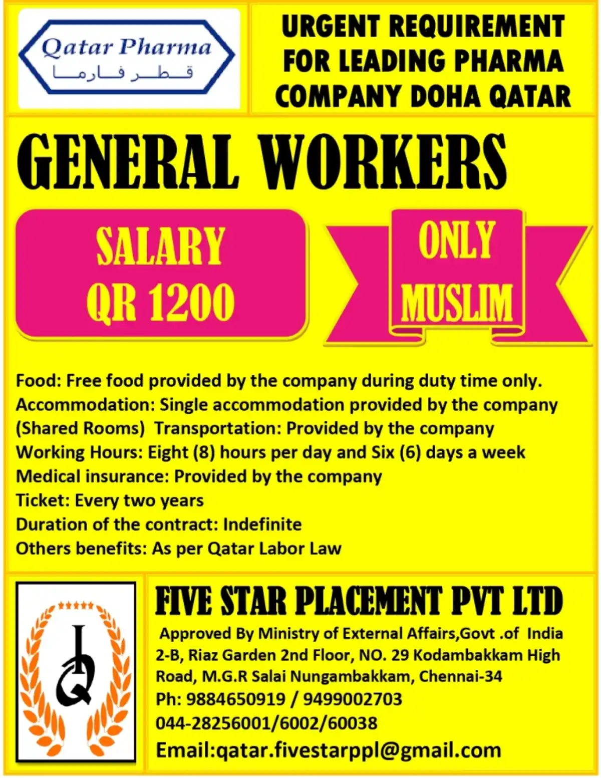 Five Star Placement Pvt Ltd, approved by the Ministry of External Affairs, Government of India, is conducting recruitment for General Worker positions at a premier pharmaceutical company in Doha, Qatar. This is an immediate hiring requirement for suitable candidates.