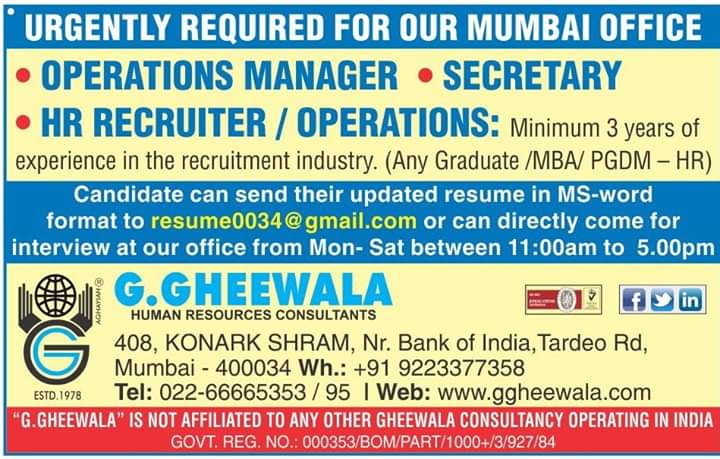 Note:- G Gheewala human resources consultant do not link with any other sub office opening in India.