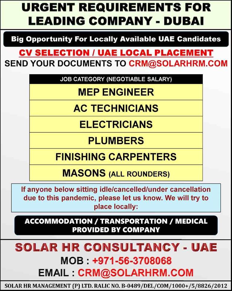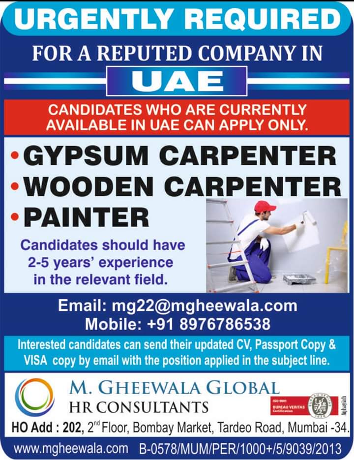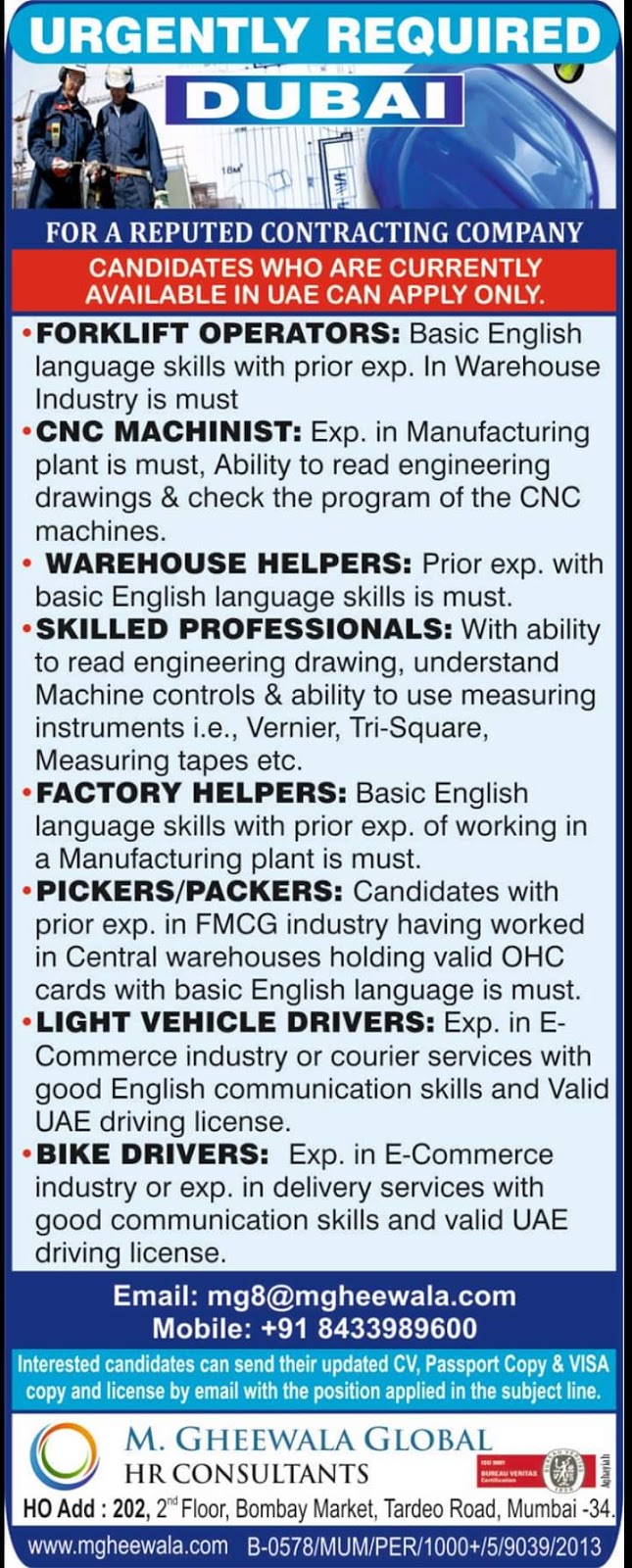 Urgently required for a reputed company in UAE, candidates were currently available in UAE can apply only.