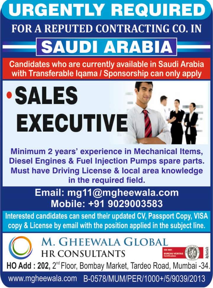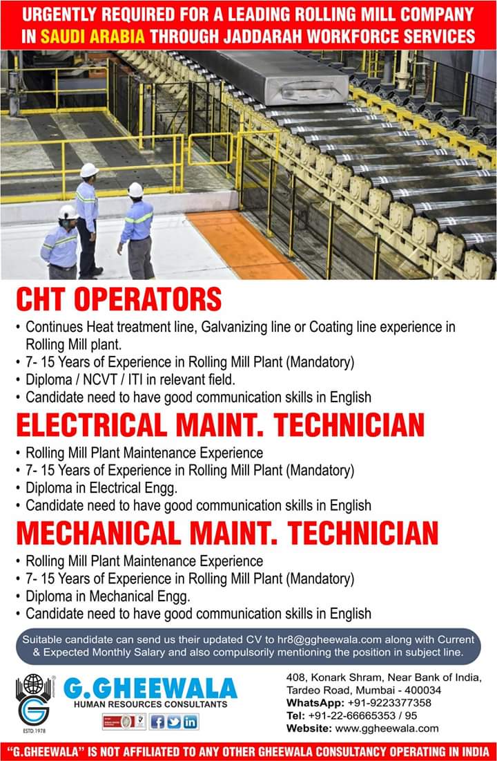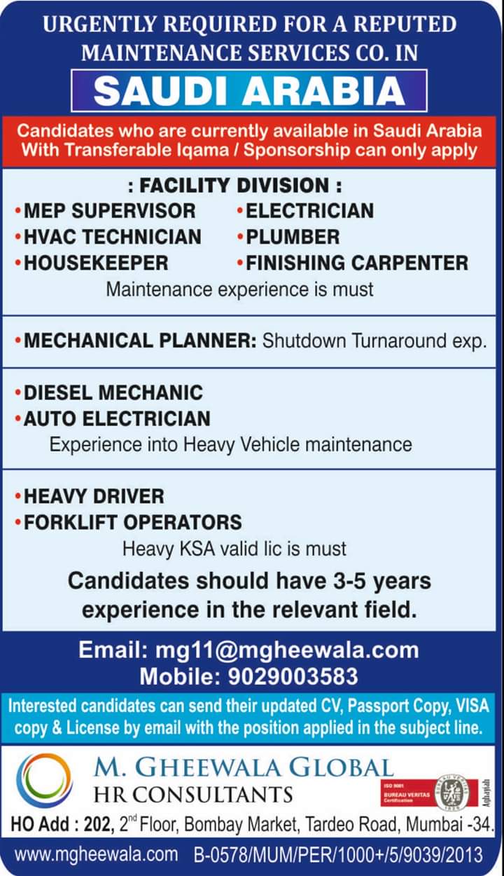Urgently required for a reputed maintenance company in Saudi Arabia, candidates were currently available in Saudi Arabia with transferable Iqama / sponsorship can apply only