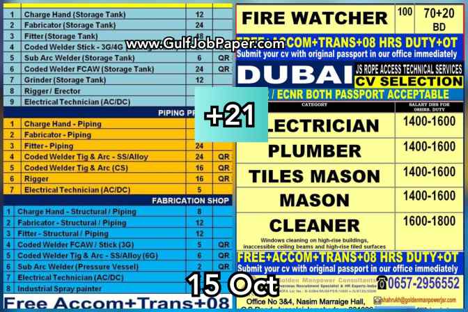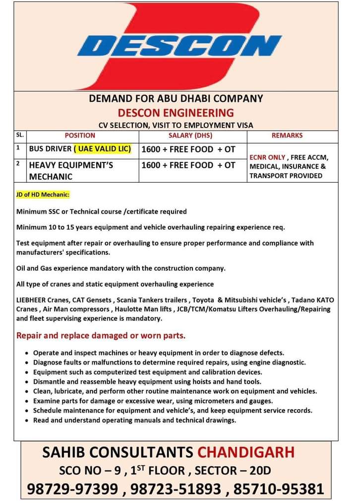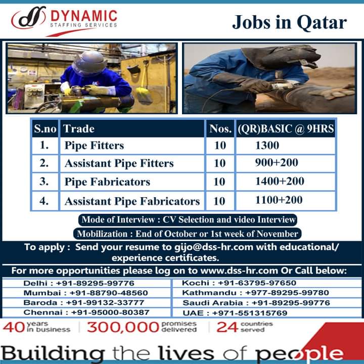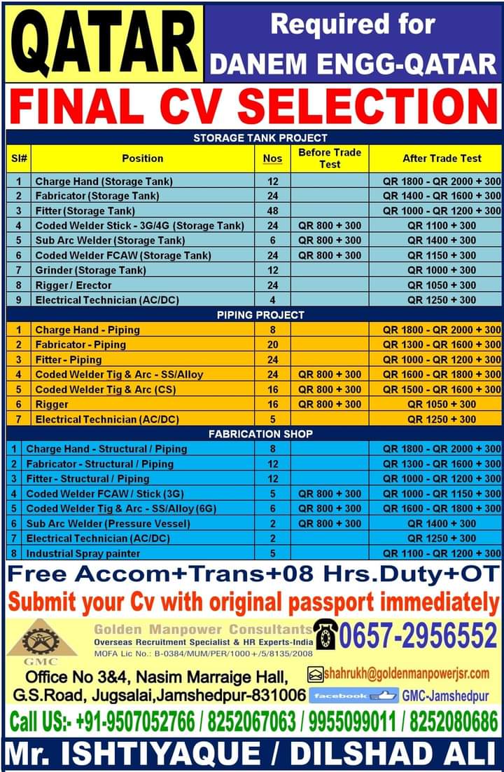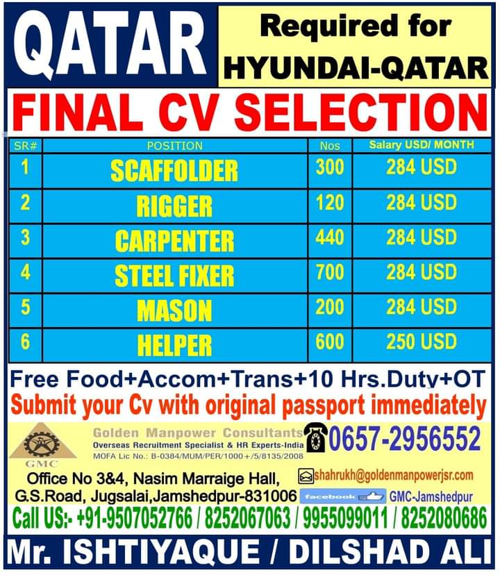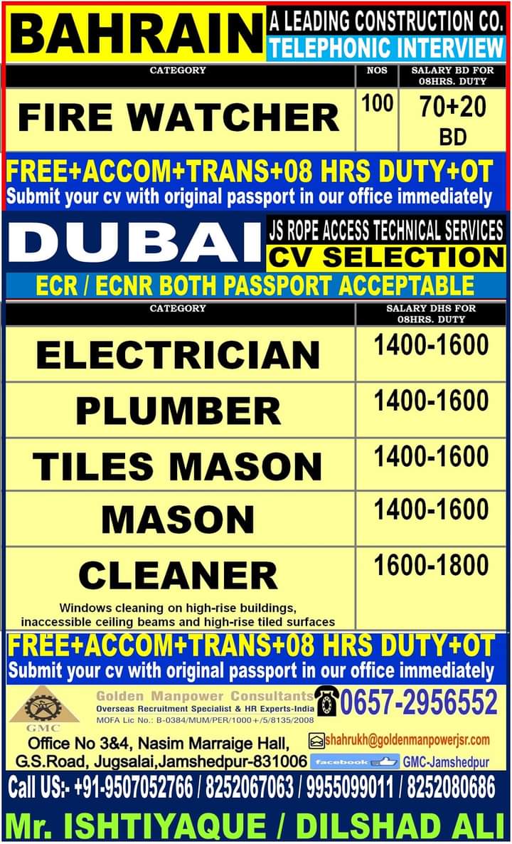 Jobs in various gulf countries are mentioned below for various position. To know more information of your desire position, contact to respective office.