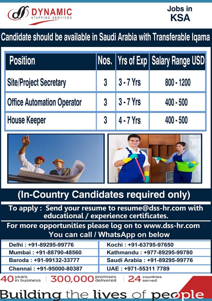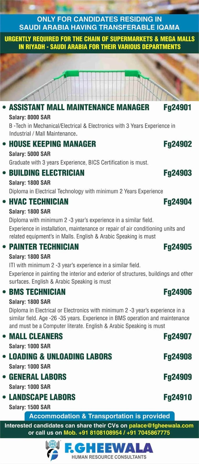 Required For the Chain of Supermarkets & Mega Malls, Candidates must available in Saudi Arabia Having Transferable Iqama