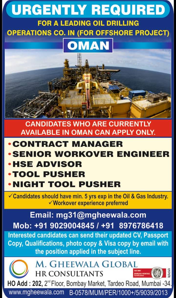 Required for Oil drilling operation company in Oman, candidate must available in Oman to apply.
