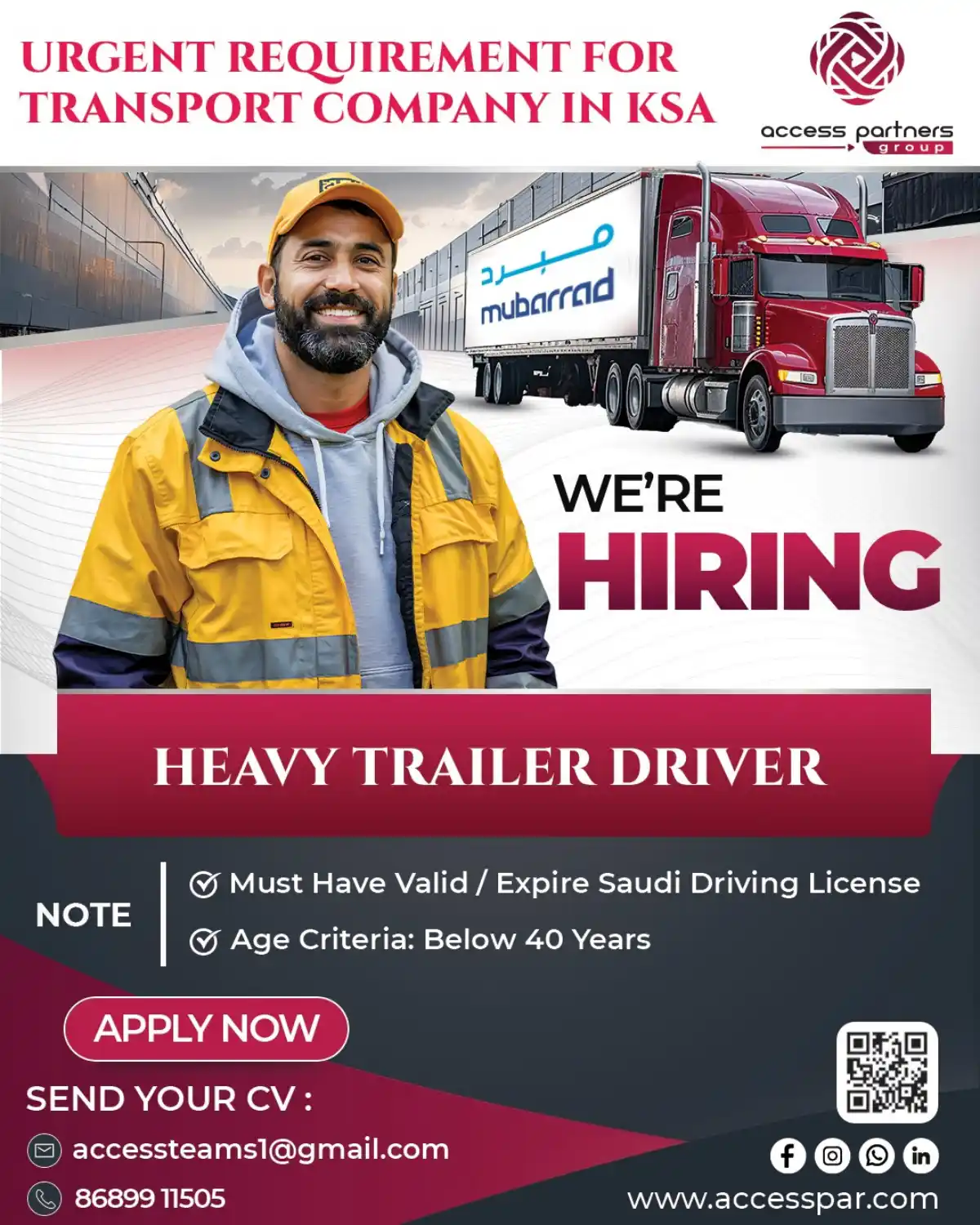 Access Partners Group is urgently hiring Heavy Trailer Drivers in KSA. Must have a valid or expired Saudi driving license and be below 40 years. Apply now with your CV.