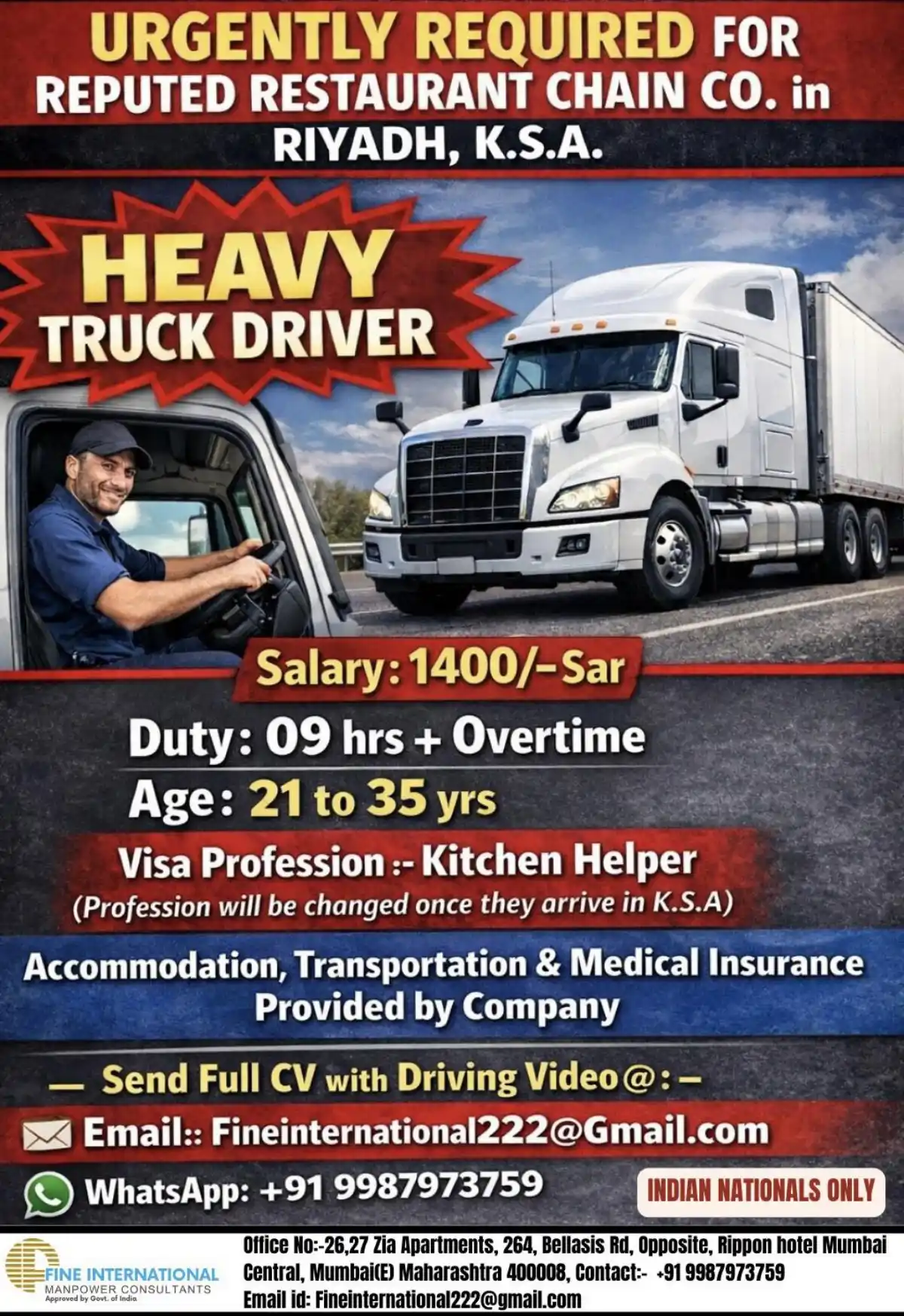 Urgent requirement for Heavy Truck Driver in Riyadh, KSA. Salary 1400 SAR, accommodation, transportation, medical insurance. Age 21-35. Indian nationals apply now.