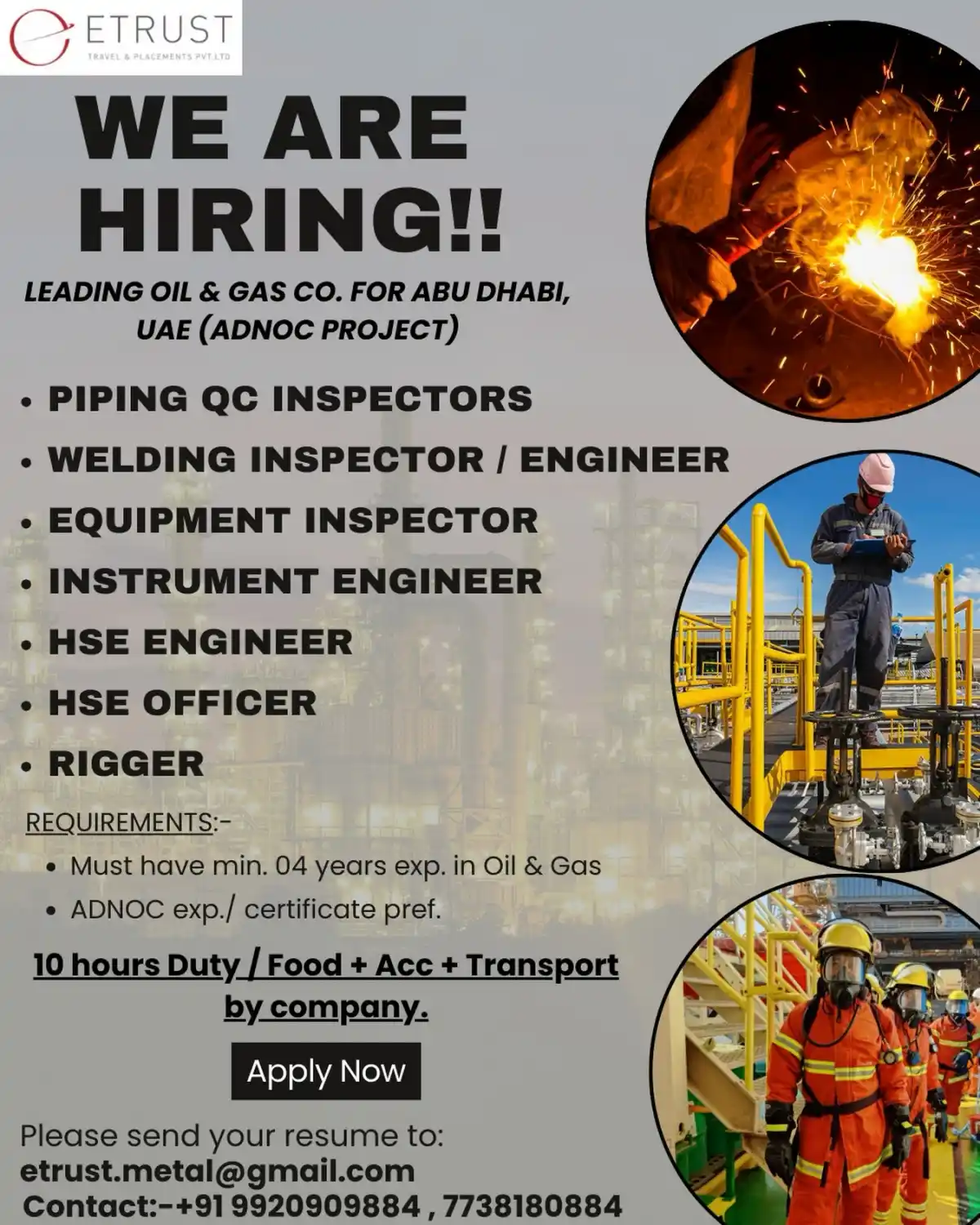 ETRUST TRAVEL & PLACEMENTS PVT LTD is proud to announce immediate hiring for a leading Oil & Gas company in Abu Dhabi, UAE, specifically for the prestigious ADNOC Project. We are seeking experienced and dedicated professionals to join our dynamic team and contribute to one of the region’s most significant energy projects.