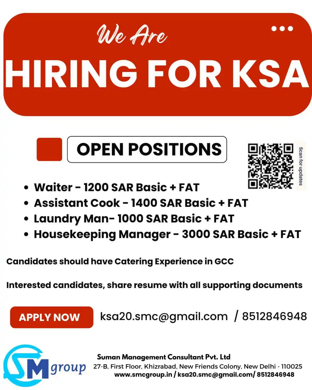 Suman Management Consultant Pvt. Ltd is currently recruiting for several positions in the Kingdom of Saudi Arabia (KSA). We are looking for qualified and experienced candidates to join our client’s team in the catering and hospitality sector.