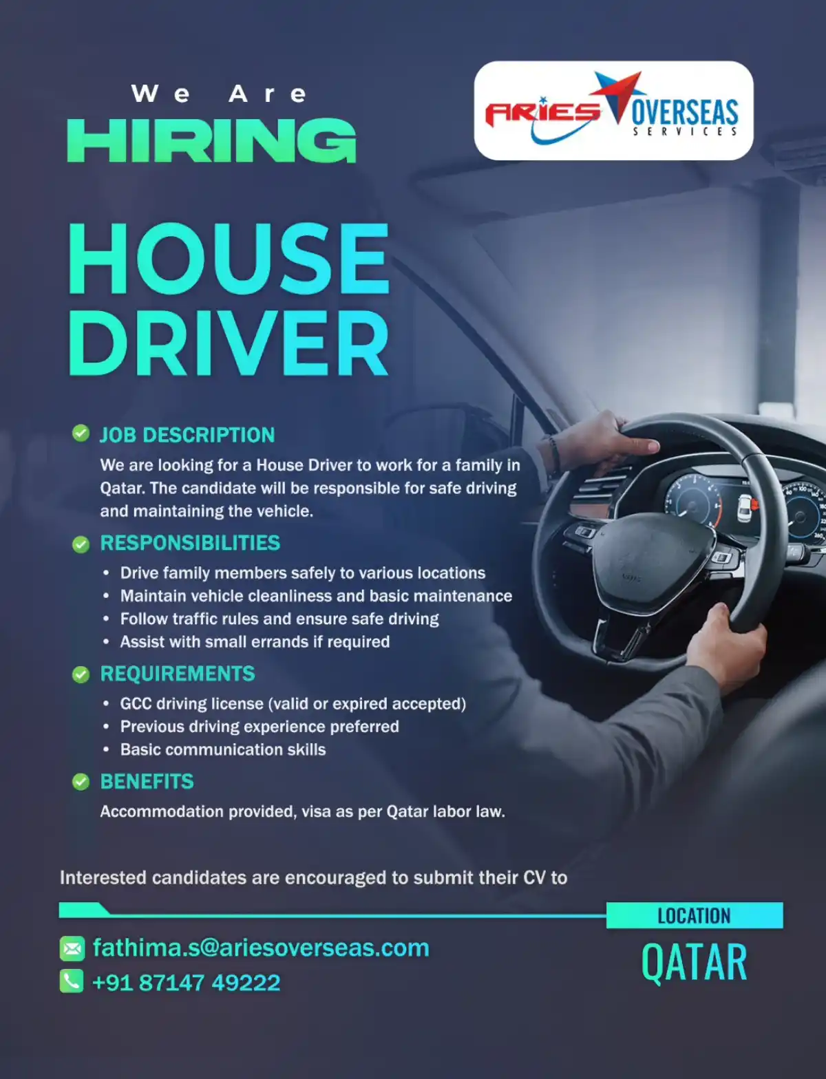 Apply for House Driver Job in Qatar with Aries Overseas. Accommodation provided, visa as per Qatar labor law. GCC driving license accepted. Send your CV now!