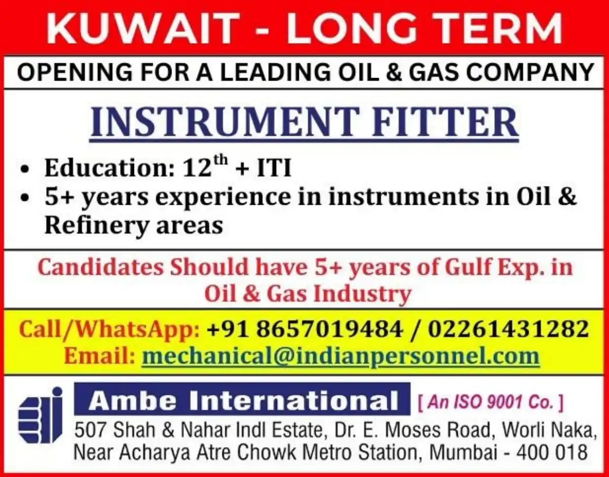 Apply for Instrument Fitter position in Kuwait with a leading Oil & Gas company. Requires ITI certification, 5+ years experience in Oil & Refinery areas, and 5+ years Gulf experience. Contact +91 8657019484.