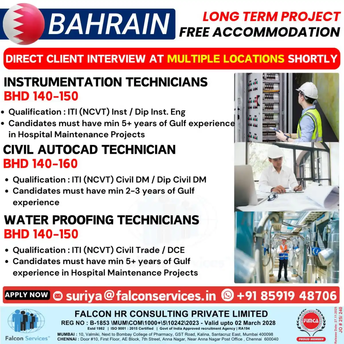 Apply for Instrumentation Technicians, Civil AutoCAD Technicians, and Water Proofing Technicians positions in Bahrain. Minimum 2-5 years Gulf experience required. Direct client interviews. Free accommodation provided. Contact Falcon Services.