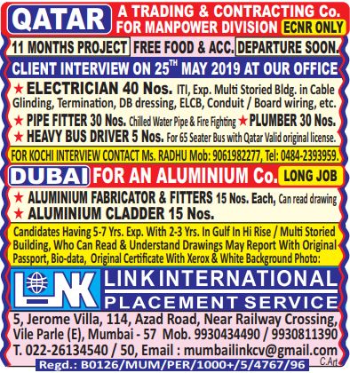 Gulf Jobs Interviews In Mumbai on 25 May 2019 in Different Offices.