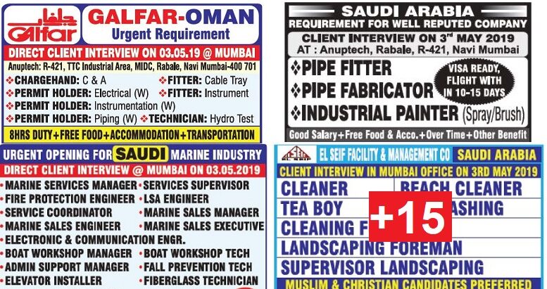 Gulf Jobs Interviews In Mumbai on 3rd May 2019 in Different Offices.