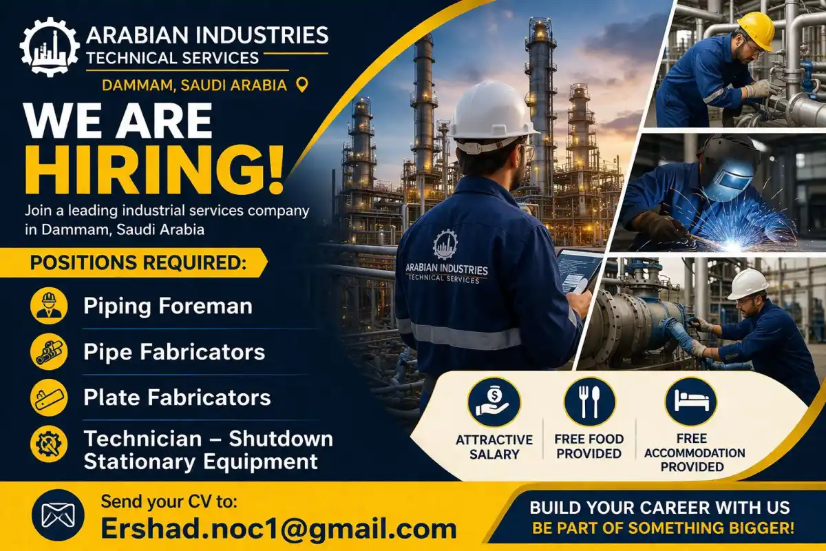 Arabian Industries Technical Services is hiring Piping Foreman, Pipe Fabricators, Plate Fabricators, and Technicians in Dammam, Saudi Arabia. Enjoy attractive salary, free accommodation, and free food. Submit your CV today!Arabian Industries Technical Services, a leading industrial services company based in Dammam, Saudi Arabia, is actively seeking skilled professionals to join our dynamic team. We are currently hiring for multiple technical positions to support our growing operations in the region.