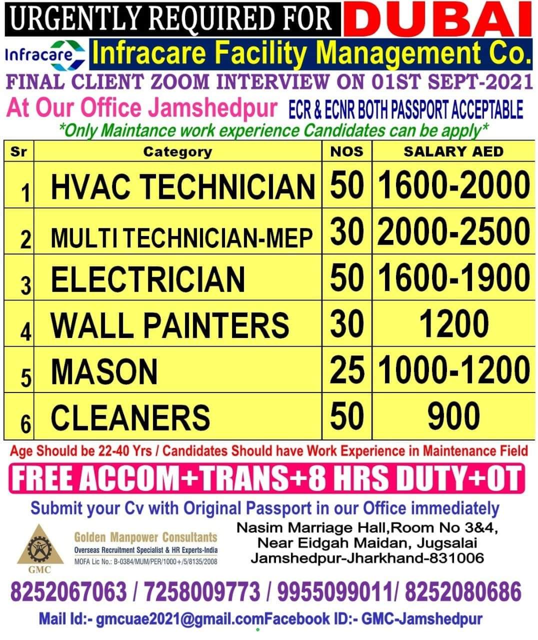 HomeUAE JobsJobs in DubaiUAE JobsJobs in DubaiBy Gulf JobAugust 27, 20210ShareFacebookWhatsApp WhatsApp Group Join WhatsApp Jobs in DubaiHVAC TechnicianMulti Technician – MEPElectricianWall PaintersMasonContact Details:Email: gmcuae2021@gmail.comPhone: 8252067063 / 7258009773 / 9955099011 / 8252080686Office Name:GMC Jamshedpur WhatsApp Group Join WhatsApp Previous articleGulf Overseas Jobs~26 AugustNext articleJobs in BahrainGulf Job