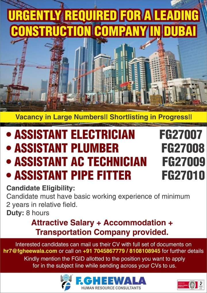 HomeUAE JobsJobs in DubaiUAE JobsJobs in DubaiBy Gulf JobDecember 29, 20200ShareFacebookWhatsApp WhatsApp Group Join WhatsApp Jobs in DubaiAssistant ElectricianAssistant PlumberAssistant Ac TechnicianAssistant Pipe FitterContact Details:Email: hr7@fgheewala.comPhone: +91 7045867779 / 8108108945Office Name:F Gheewala Human Resource Consultants WhatsApp Group Join WhatsApp Previous articleGulf Overseas Jobs~26 DecemberNext articleJobs in Oman & QatarGulf Job