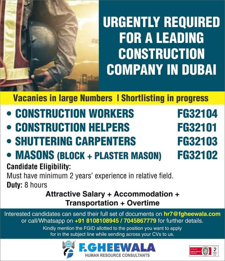 HomeUAE JobsJobs in DubaiUAE JobsJobs in DubaiBy Gulf JobJanuary 3, 20210ShareFacebookWhatsApp WhatsApp Group Join WhatsApp Jobs in DubaiConstruction WorkersConstruction HelpersShuttering CarpentersMasons (Block + Plaster Mason)Contact Details:Email: hr7@fgheewala.comPhone: +91 8108108945 / 7045867779 Office Name:F Gheewala Human Resource Consultants WhatsApp Group Join WhatsApp Previous articleJobs in QatarNext articleJobs in QatarGulf Job