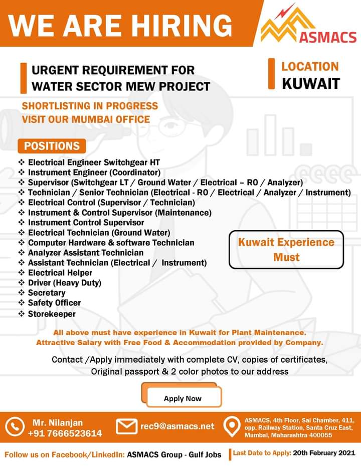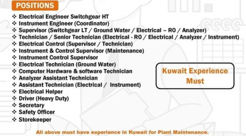 - Supervisor (Switchgear LT / Ground Water / Electrical – RO /